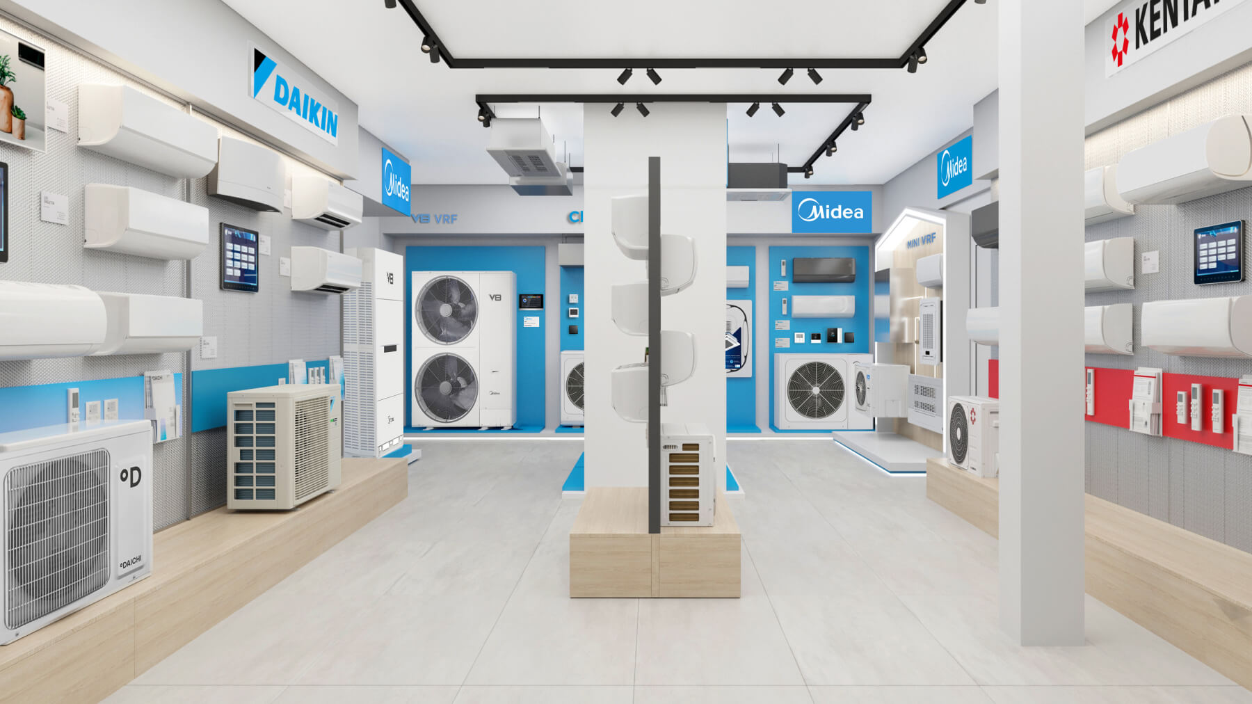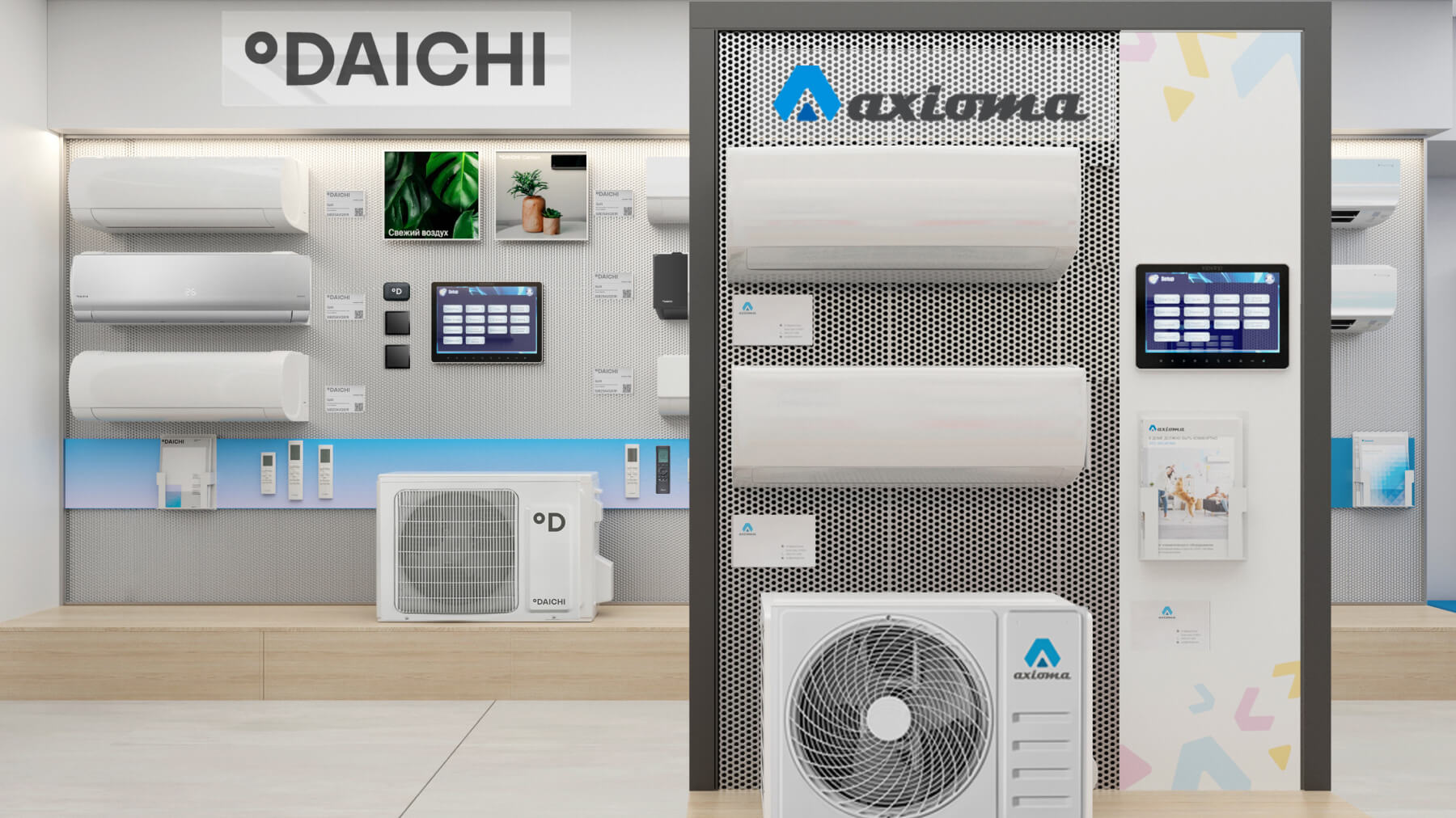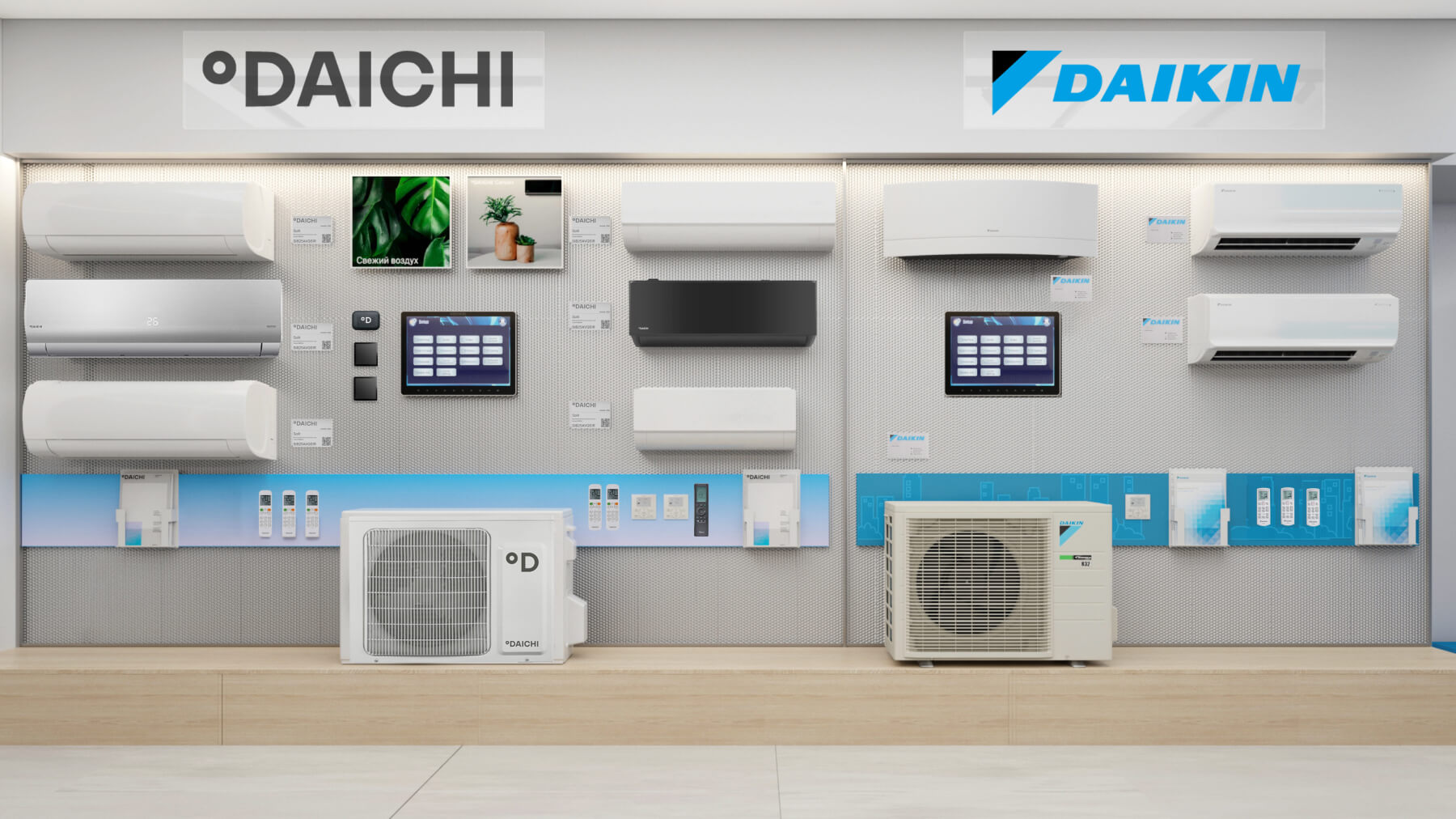 В шоуруме представлен наиболее полный модельный ряд бытовых и коммерческих сплит‑систем, VRV/VRF оборудования всех брендов из продуктового портфеля Даичи, а также наши собственные «Облачные» разработки.