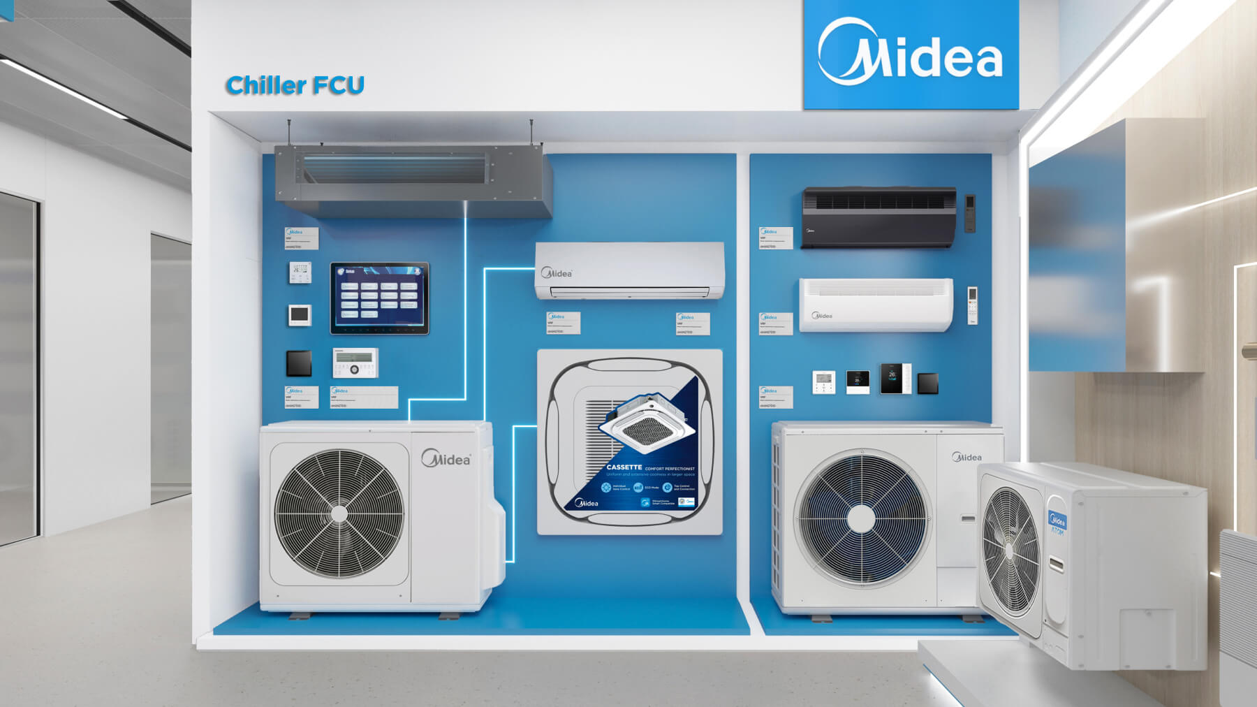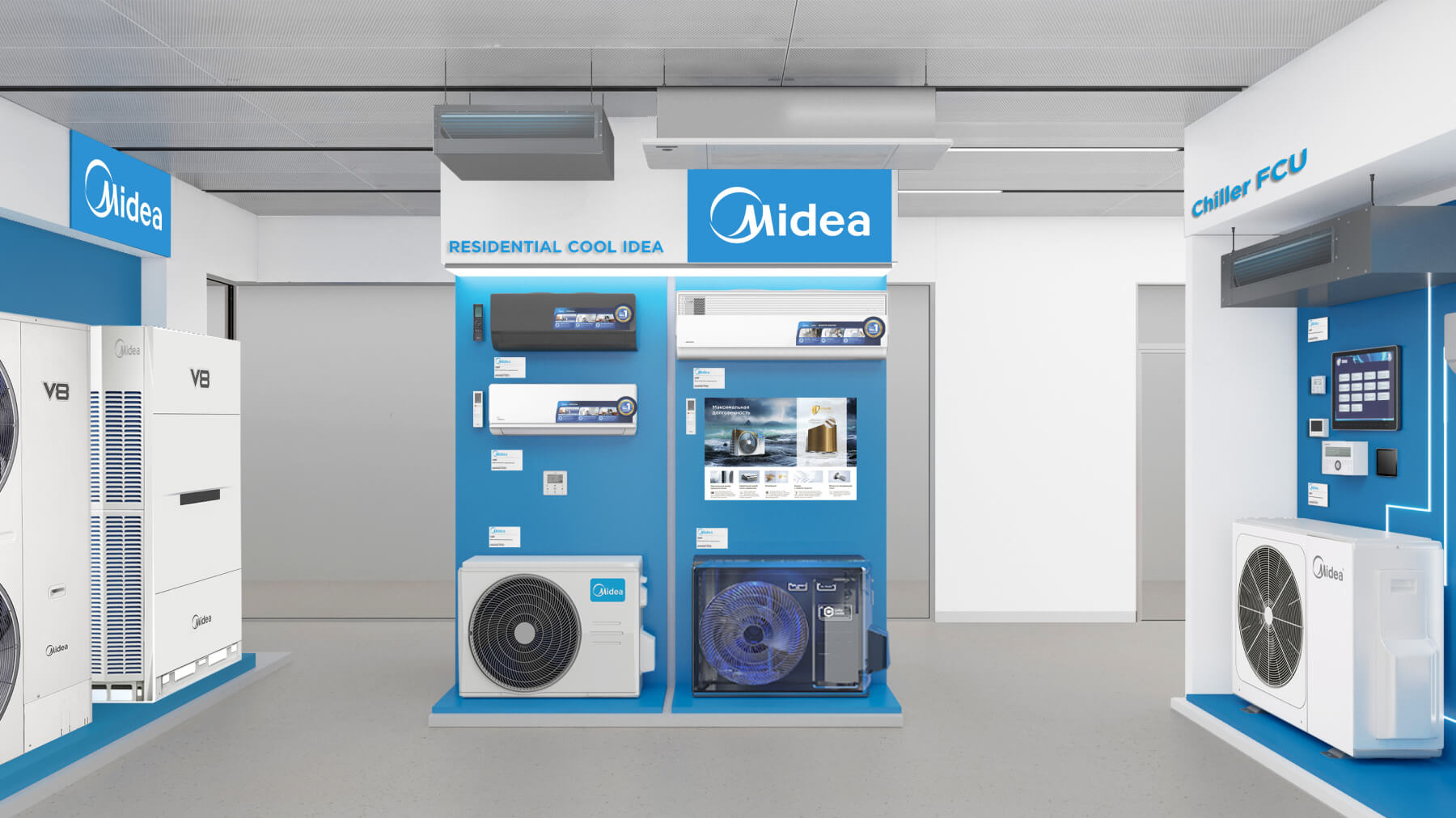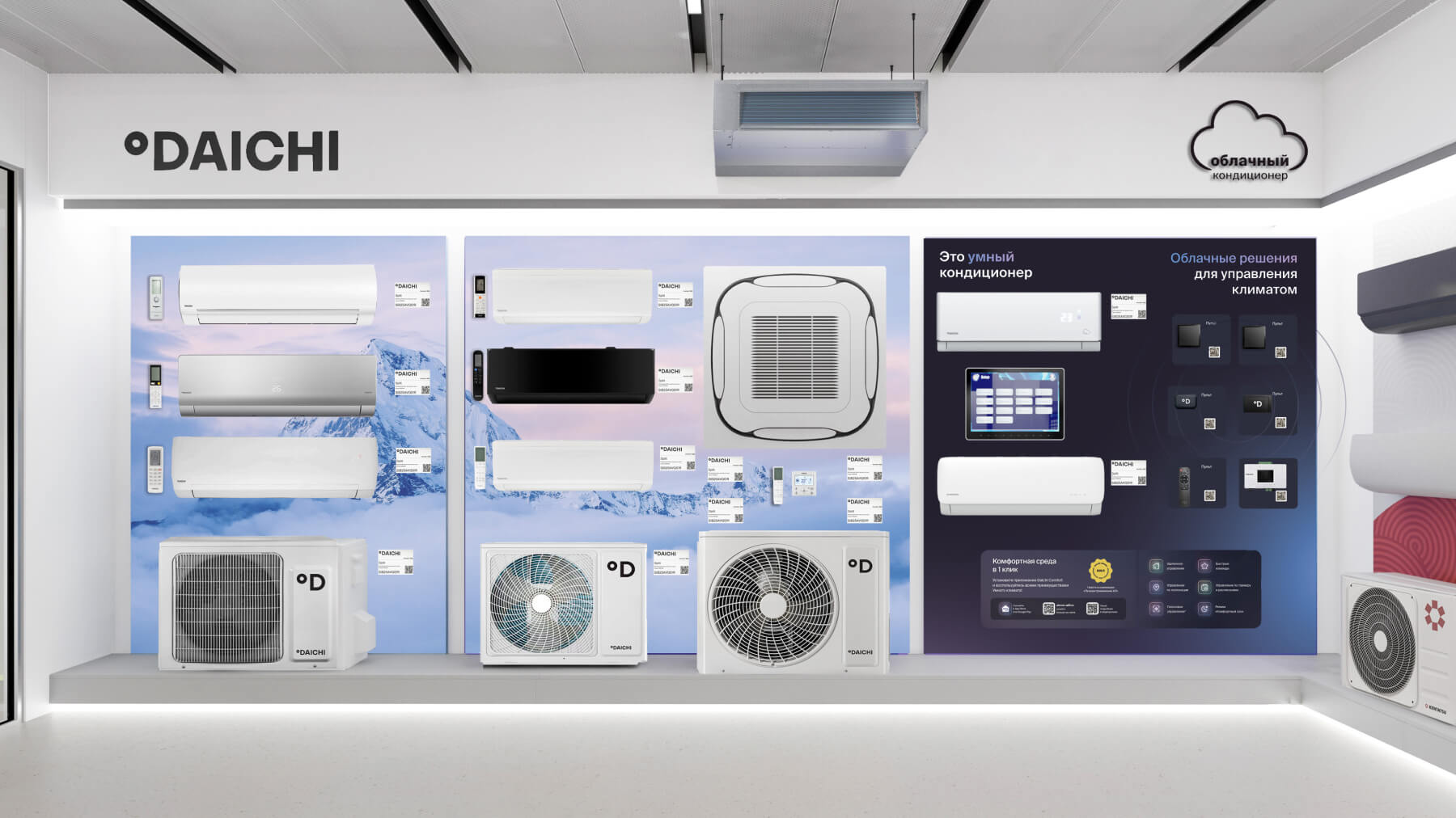 В шоуруме представлен наиболее полный модельный ряд бытовых и коммерческих сплит‑систем, VRV/VRF оборудования всех брендов из продуктового портфеля Даичи, а также наши собственные «Облачные» разработки.